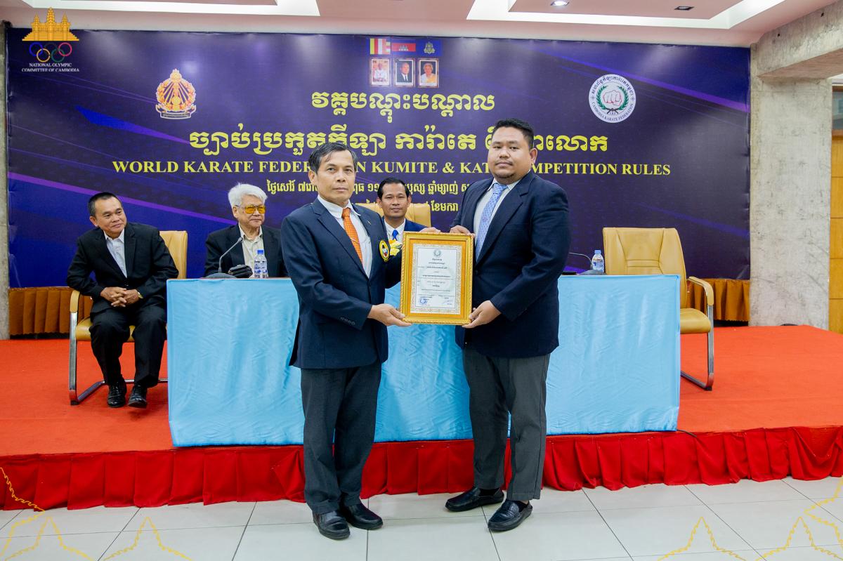 In particular, Mr. Siyon Sthapor, Deputy Director of the Department of Professional and Mass Sports, praised and highly appreciated the participants who are coaches, referees and judges for spending their time to learn new knowledge and skills of the world karate rules. He hopes and believes that all participants will use these professional skills to share with male and female athletes and use them to judge the competition with fairness and justice manner.