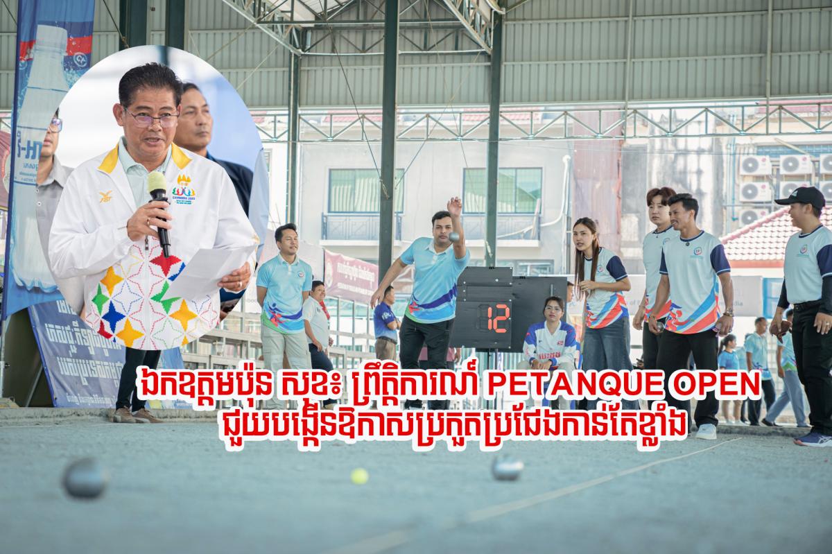 ភ្នំពេញ៖ ព្រឹត្តិការណ៍ប្រកួតកីឡាប៉េតង់បើកទូលាយ (Petanque Open) ជាការប្រកួតរៀបចំឡើងដើម្បីចូលរួមអបអរដល់ទិវាអន្តរជាតិនារី លើកទី១១៥ ដែលទើបបញ្ចប់ទៅកាលពីថ្ងៃទី៨ មីនា កន្លងទៅ ត្រូវបាន ឯកឧត្តម ប៉ុន សុខ អគ្គនាយក នៃ អគ្គនាយកដ្ឋានកីឡា នៃក្រសួងអប់រំ យុវជន និងកីឡា ចាត់ទុកជា ព្រឹត្តិការណ៍ប្រកួតជួយបង្កើនឱកាសឱ្យ កីឡាករ-កីឡាការិនី និយមលេង កីឡាប៉េតង់ ពីគ្រប់ទិសទី នៃប្រទេសកម្ពុជា មកជួបជុំគ្នាប្រកួតប្រជែង ផ្លាស់ប្តូរបទពិសោធ និងការពង្រឹងនូវកម្រិតសមត្ថភាពឱ្យកាន់តែខ្លាំងឡើងបន្ថែមទៀត។